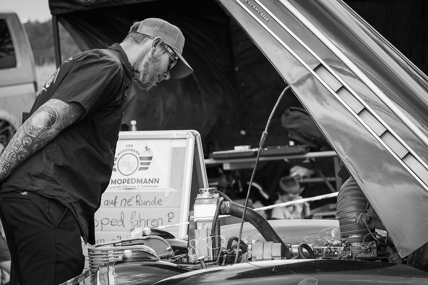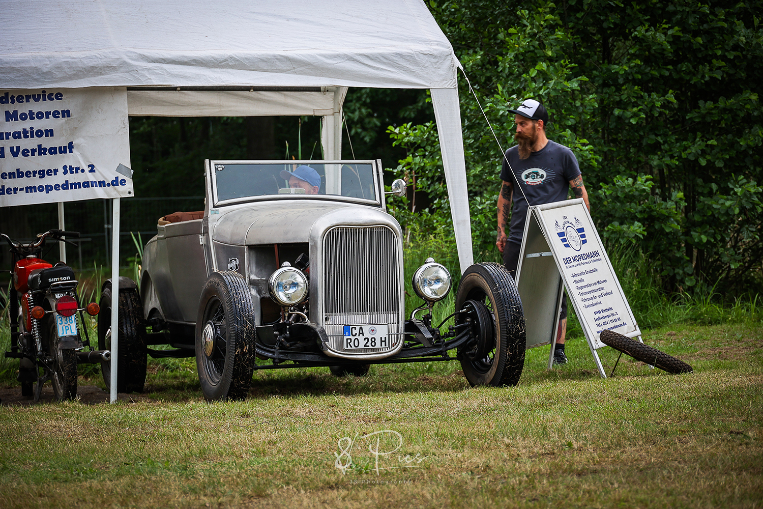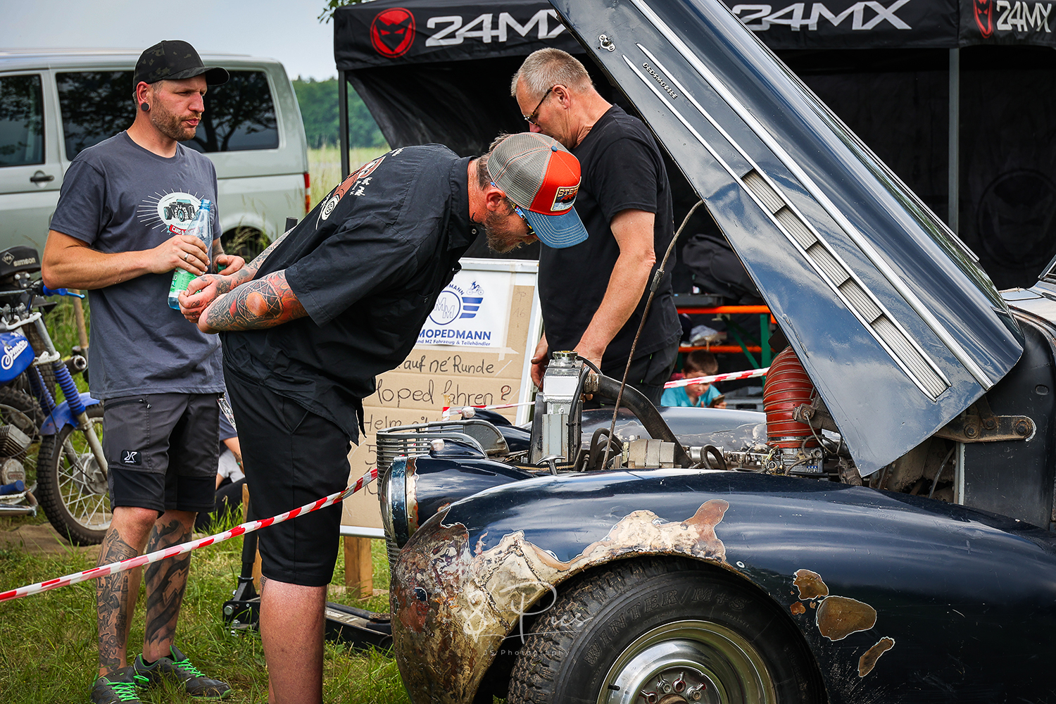 ..waren definitiv nicht die Gründe für ausgesprochene Gedanken. Ihr könnt euch ja sicherlich denken, wenn man ein Restaurant mit Hotel und zudem ein erfülltes Familienleben führt, bleibt da nicht mehr viel Zeit für anderes. Auf jedes x-beliebige Treffen fahren ist dann nicht möglich. Aber dann und wann in die Garage setzen.. dann ein wenig Jake la Botz auf die Ohren und Goldi Cola und auf einmal: „Wenn man nicht auf die Treffen fahren kann, ja dann macht man halt sein eigenes..“ – Garagengeschichten. Es gibt unzählige, doch diese eine, die bewahrheitete sich dann im letzten Jahr, 2024, im Juni..